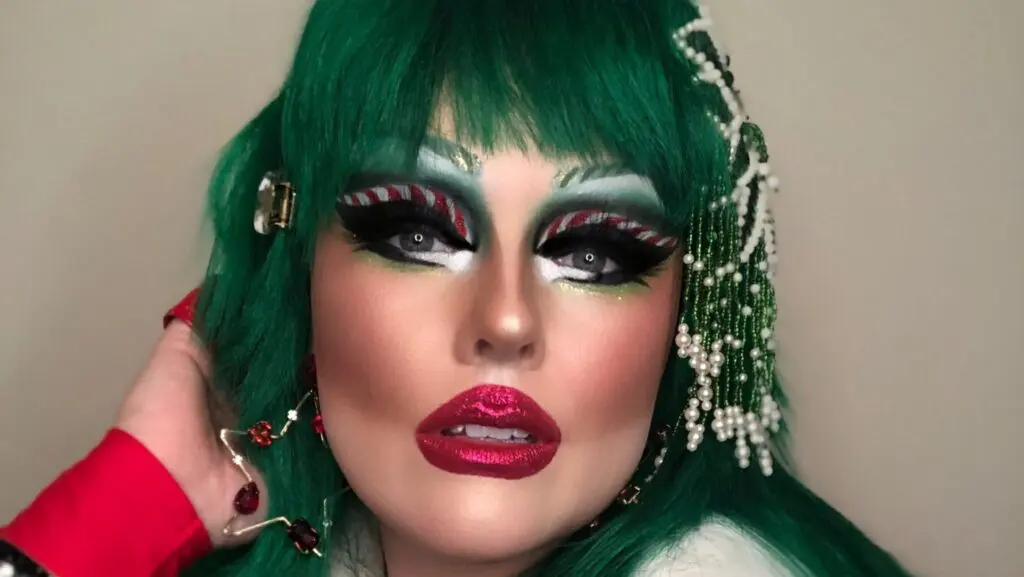 Tarah Cards is wearing Elektra Microfine glitters in Ruby Red and Peridot Green mixed with the Liquid Transformer, and Fire Opal Body Shimmer.